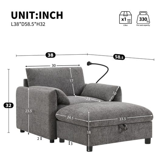 38" Single Sofa with Storage Ottoman, Adjustable Phone Holder, USB Charger, Side Storage Pockets, Pillow-Like Armrests, Wide Seat Chaise Lounge for Living Room&Apartment, Chenille, 4 Colors