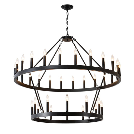 2 Tiers Wagon Wheel Chandelier Wooden Farmhouse 36-Light(24+12) or (12+24 ), Black Metal Chandeliers 2-Story Light Fixtures Industrial for High Ceiling Living Dining Room Foyer. Adjustable Height