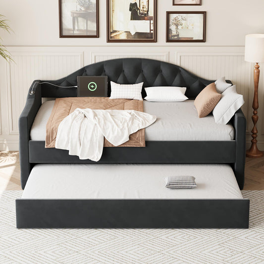 Twin Size Tufted Upholstered Daybed with Trundle ,Velvet Sofabed with USB&Type-C Charging Ports,No Box-spring Needed,Black