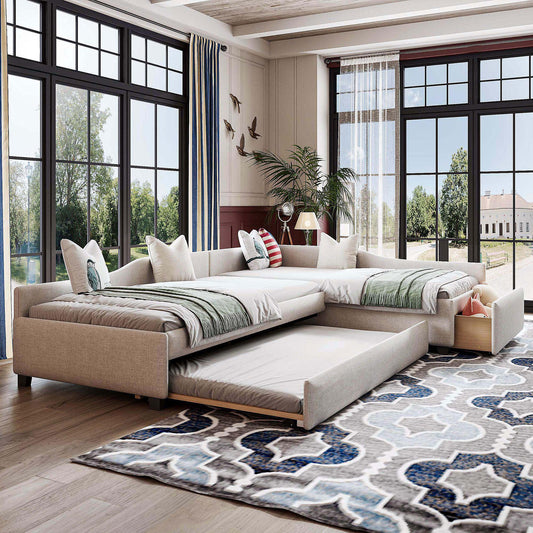 Upholstered Double Twin Size Daybed with Trundle and Drawer, Beige