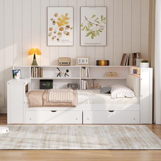 Wood Twin Size Platform Bed with Storage Shelves, Drawers, Charging Station, LED, Desk and Upholstered Headboard, White+Beige Cushion
