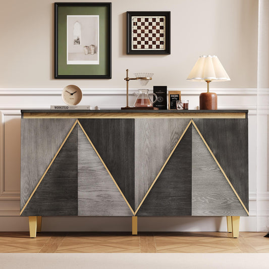 TREXM 60" Retro Buffet Cabinet with Storage, 4-Door Vintage Sideboard Cabinet with Dimensional Effect Doors and Adjustable Shelves for Dining Room, Kitchen, and Living Room (Light and Dark Gray)