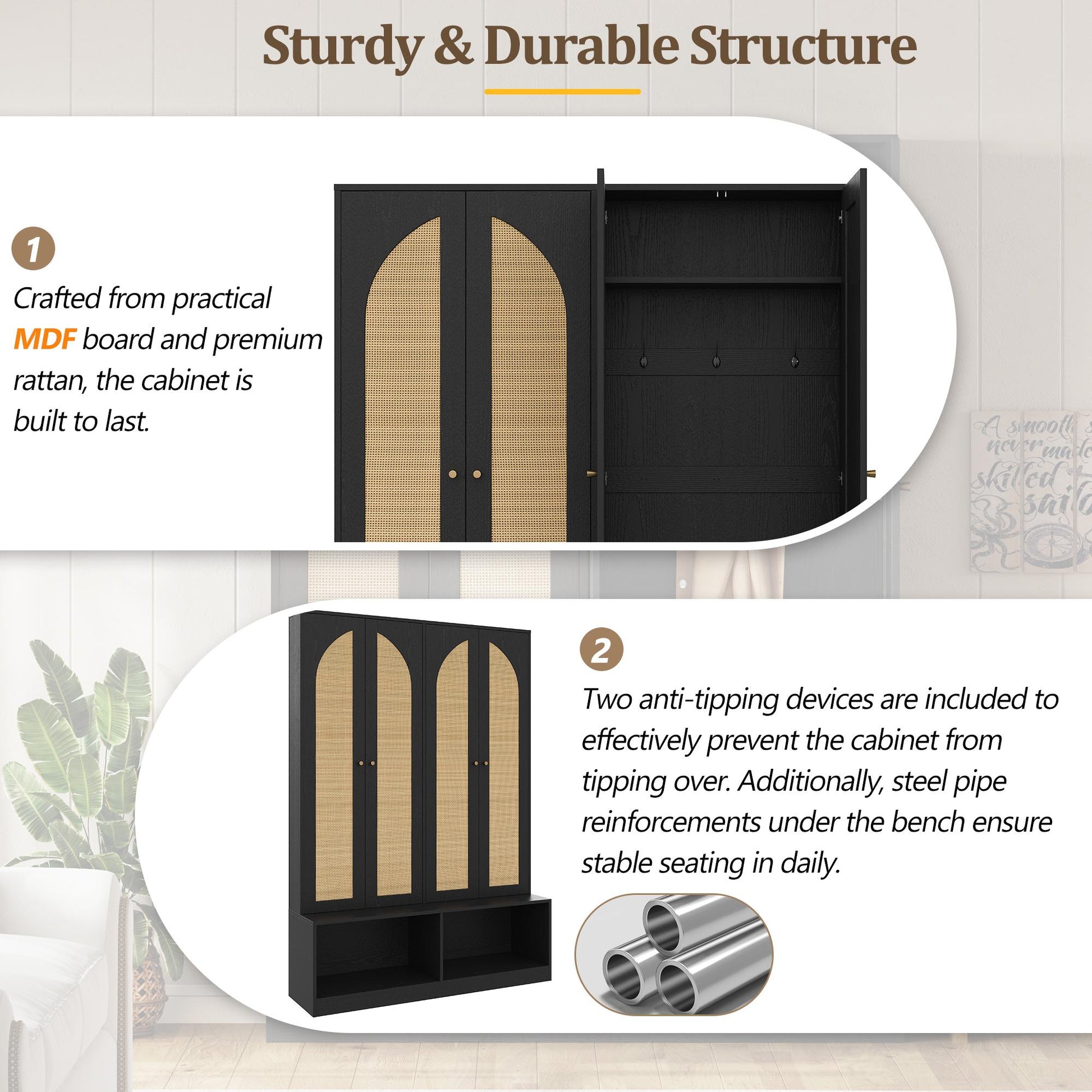 Sturdy & Durable Structure: Crafted from practical MDF board and premium rattan, the cabinet is built to last. Two anti-tipping devices are included to effectively prevent the cabinet from tipping over. Additionally, steel pipe reinforcements under the bench ensure stable seating in daily.