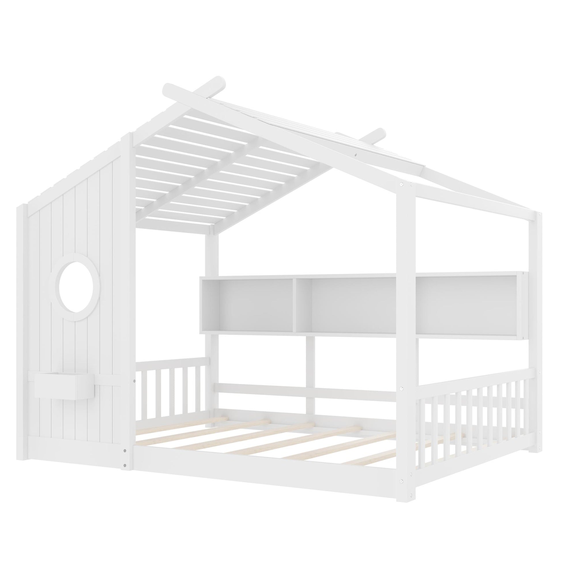Full Size Floor House Bed for Toddler, Kids Montessori Bed with Storage Shelf, Playhouse Bed with Roof Design, White