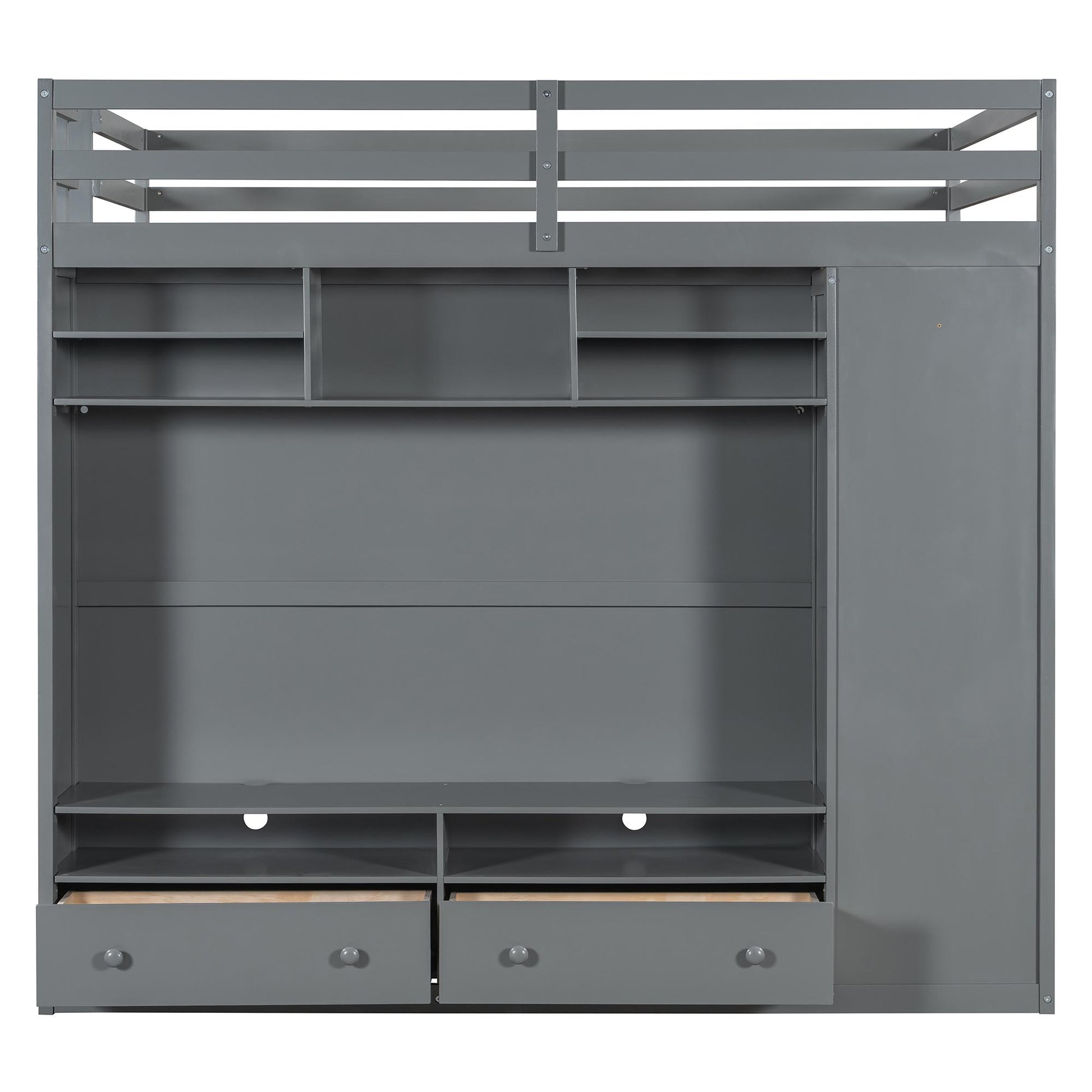 Full size Loft Bed with Drawers, Shelves and Light - Gray