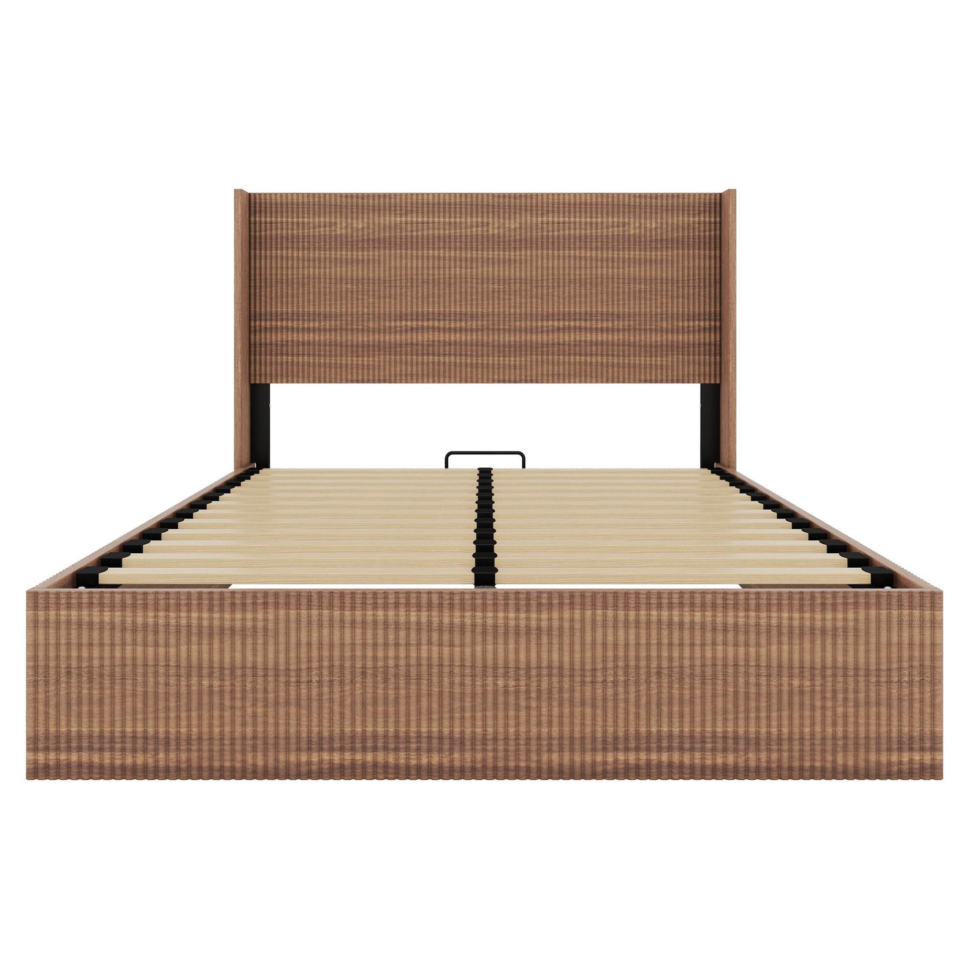 Large grooved undulating lift storage bed frame, wooden platform bed frame with lift storage, no spring box required/no noise, rustic brown slatted natural wood( Queen)