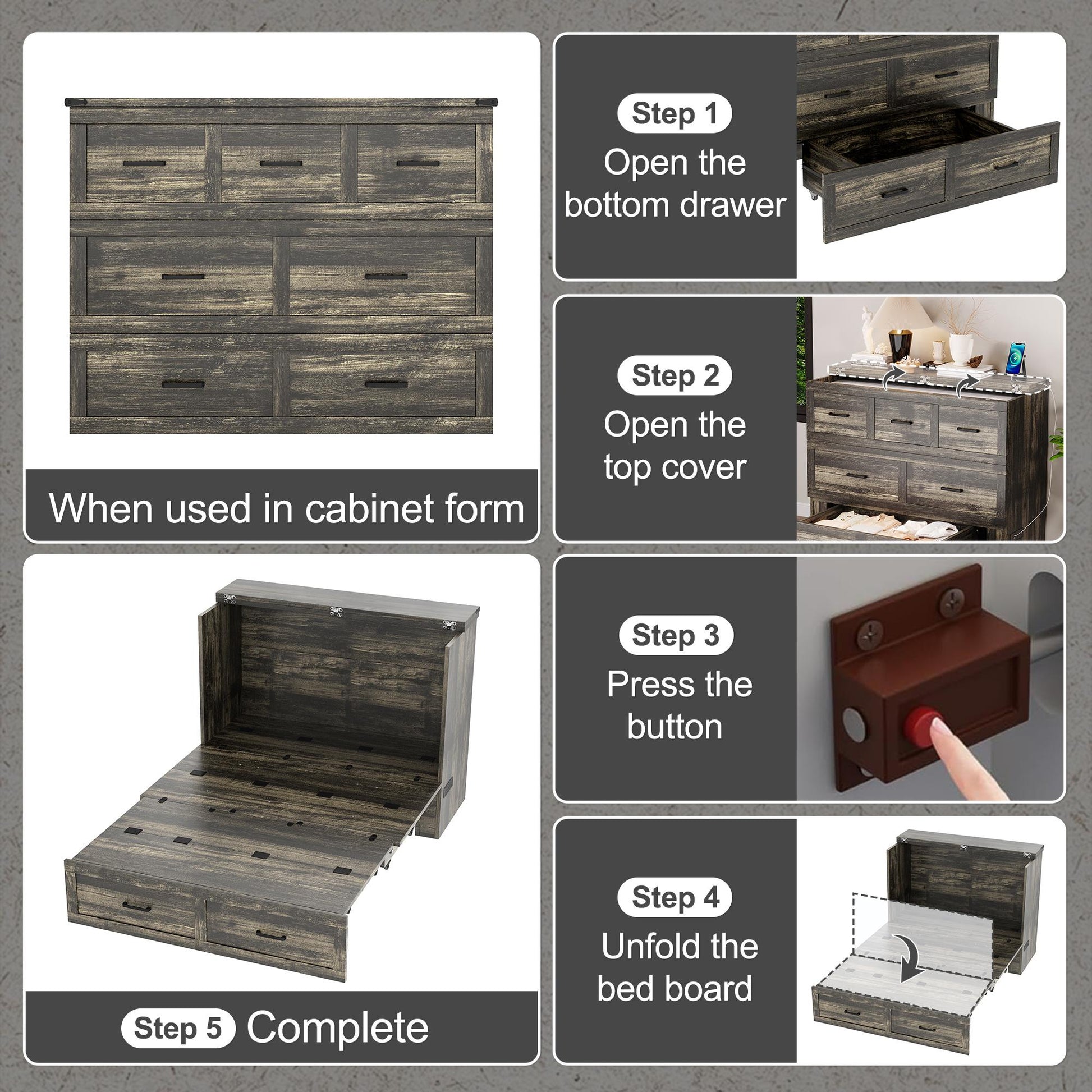 Murphy Bed Cabinet Full Size with Charging Station, Multi-Functional Foldable Platform Bed with 1 Large Storage Drawer for Guest Room, Small Bedroom, Rustic Gray