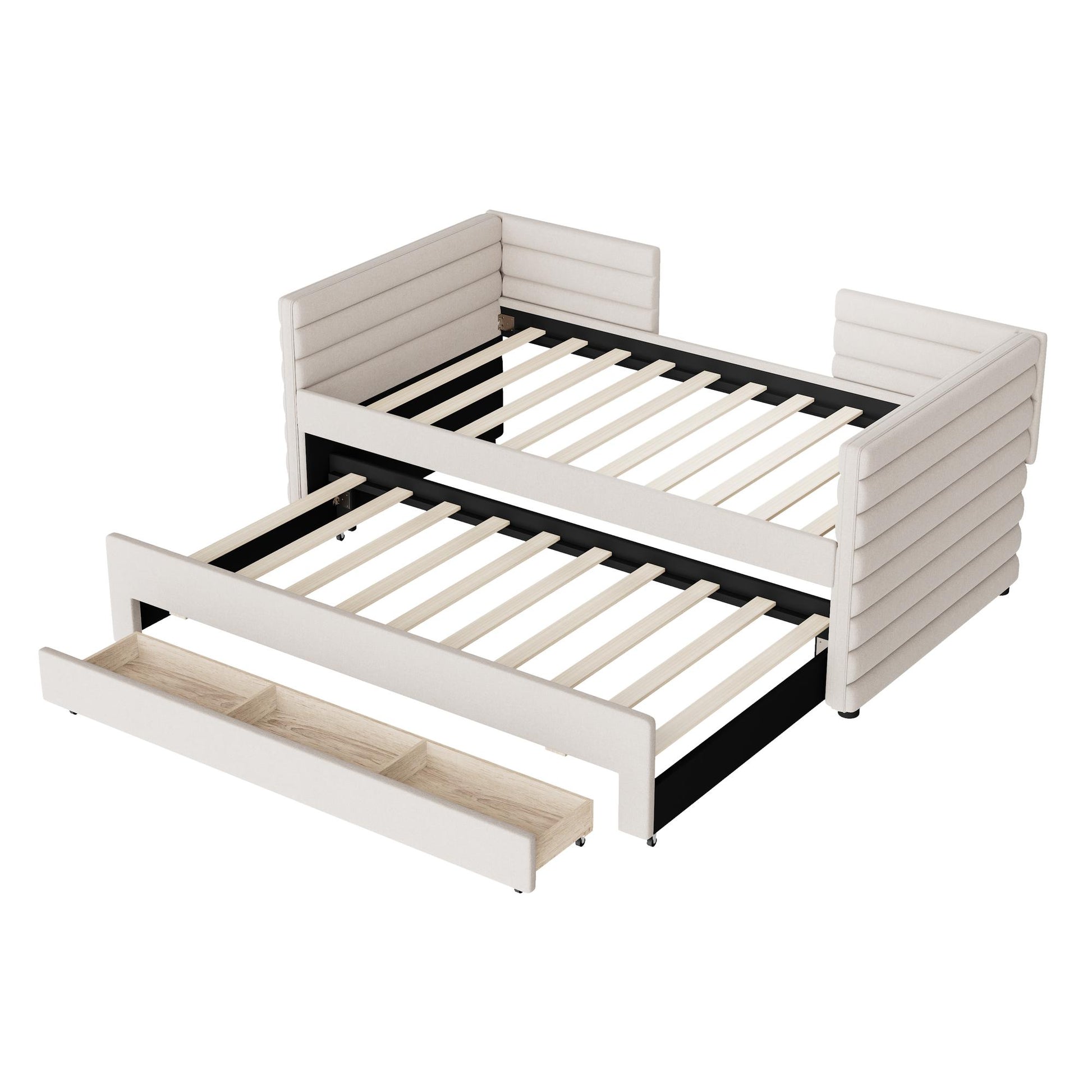 Twin Size Upholstered Daybed with Trundle and 3 Storage Drawers, Short-haired Linen Fabric Sofa Bed for Guest Room, Living Room, Space-Saving Modern Day Bed Frame, No Box Spring Needed, Beige