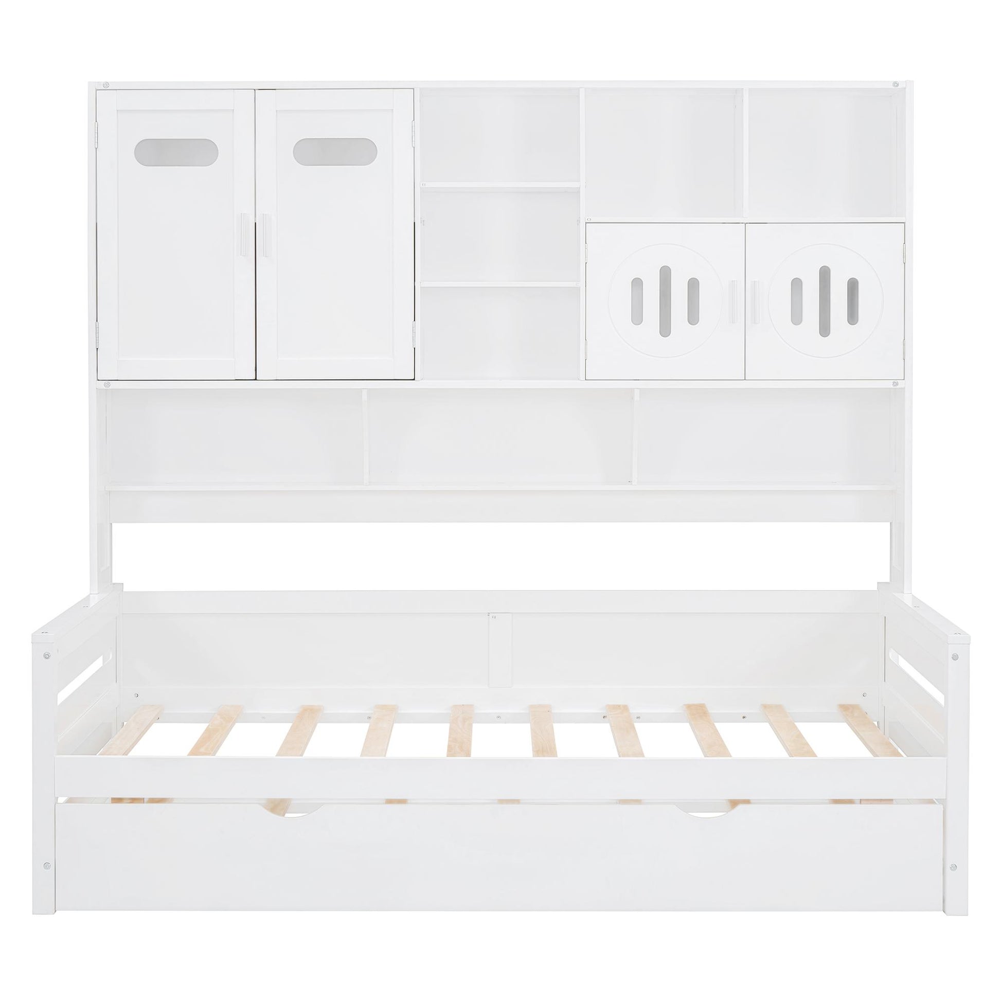 Twin Size Wooden Daybed With Twin Size Trundle, and All-in-One Cabinet and Shelf, White