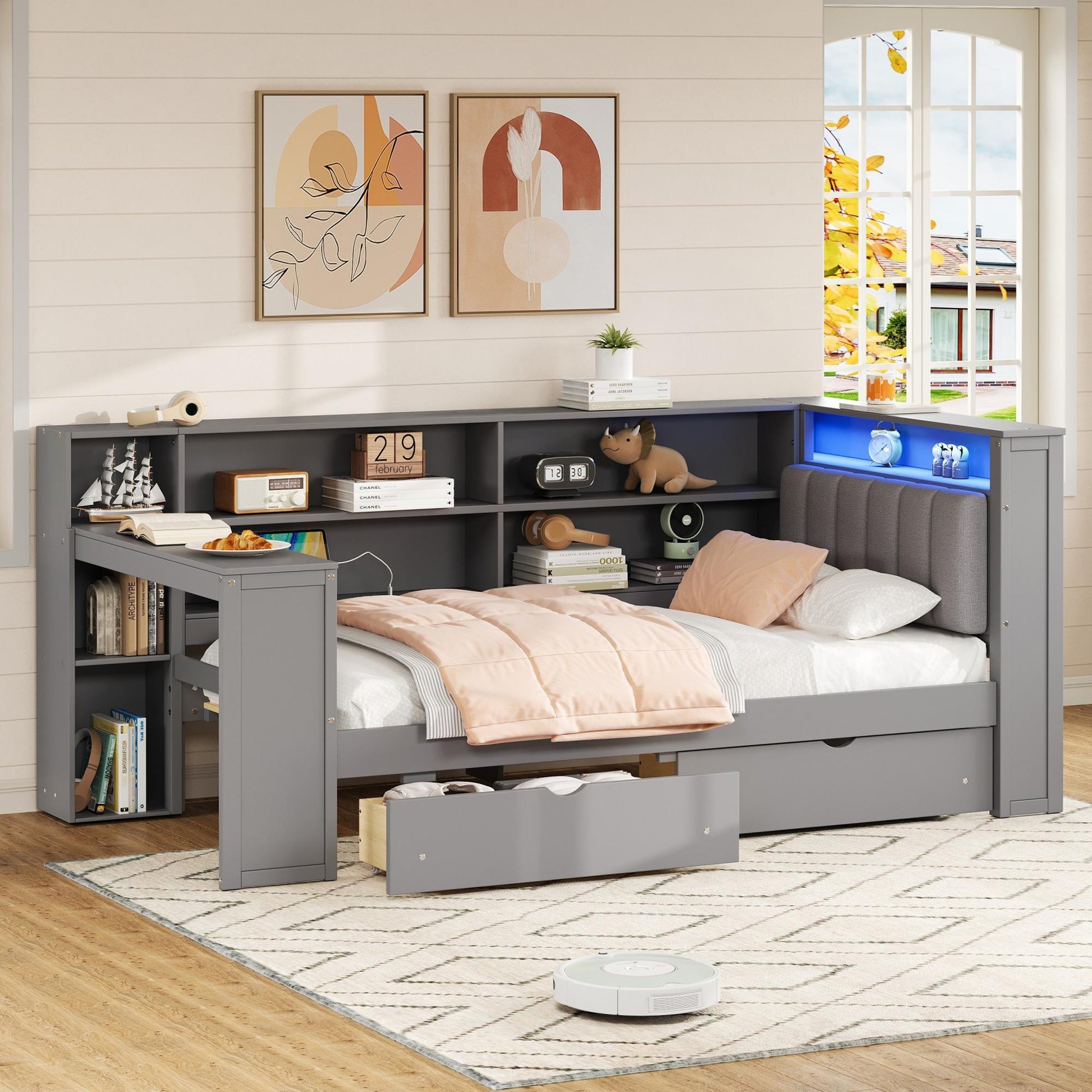 Wood Twin Size Platform Bed with Storage Shelves, Drawers, Charging Station, LED, Desk and Upholstered Headboard, Grey+ Grey Cushion